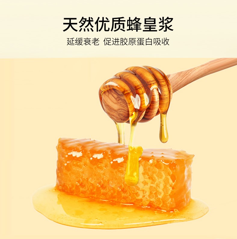蜂王浆。先用温水把脸洗净,用手指蘸 1 ~2 克蜂王浆均匀地搽在脸上,并轻轻按摩面部 2 ~3 分钟,20 分钟后用手轻触觉得不粘手后,用热毛巾擦净,再搽点护肤霜即可。功效:消除面部和眼角皱纹,以及色斑、老年斑、痤疮。