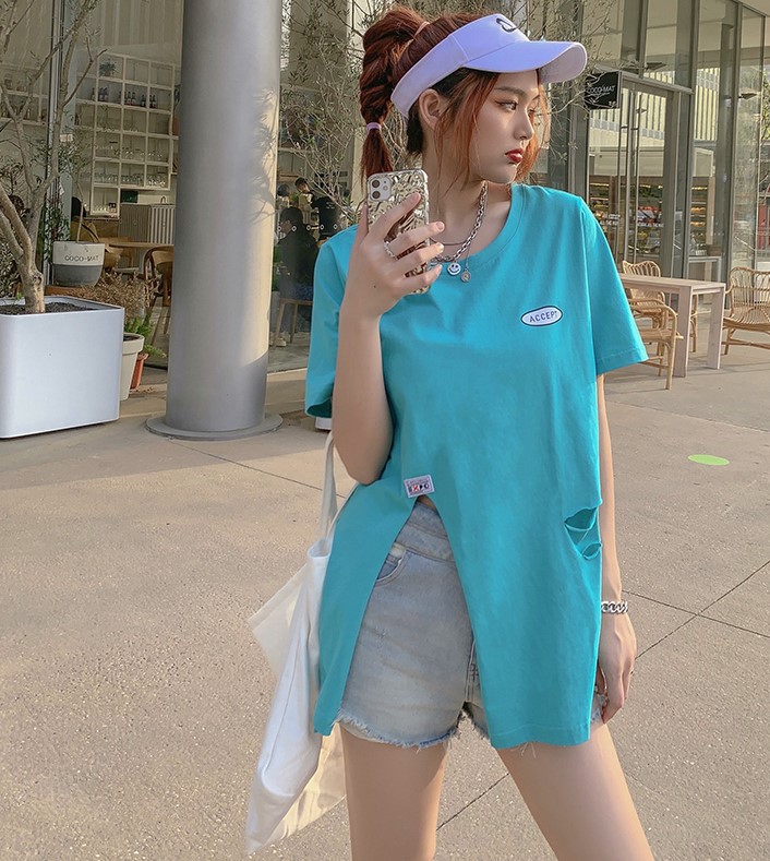 落肩的版型会比较特别一点,落肩的袖线普遍略低于人们的肩膀,不过整个效果看起来会更加宽松一些,这也是这近一年两年国内外经常出的T恤版型。