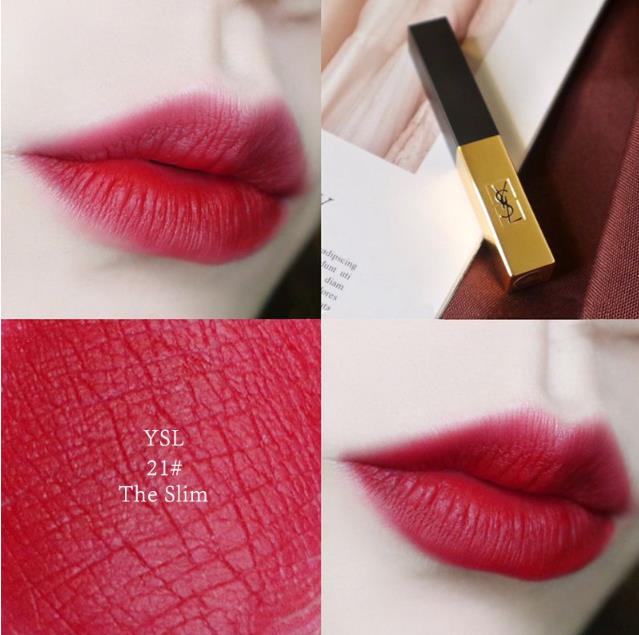 YSL小金条21号色,它是一个哑光的复古红色,有一点点偏玫,但是质感很高级,厚涂的时候气场瞬间两米八,超级无敌显白,可以让你白到发光,真的毫不夸张,它真的和普通的正红色不一样,很特别的很有气质,让你美到涂一次就像要囤货。