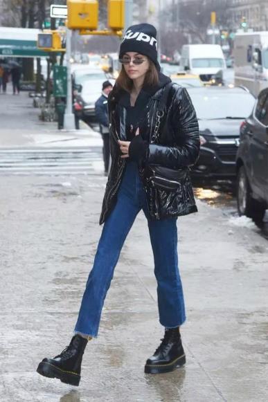 马丁靴虽然是必备的时尚单品,但也要选择适合的服饰来搭配它,这样才能彰显出鞋子的气质,一般我们会选择穿紧身裤来搭配马丁靴,瞬间提升整个人的比例。