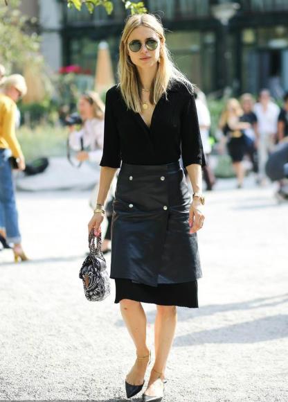 包臀裙也可以不是开叉的设计,黑色皮裙也可以经典的搭配,配上一件白色小高领针织衫,配上一件修身的呢子外套,中长款的版型很显职业感。