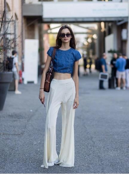 1、阔腿裤 想要大长腿和腿更细,推荐穿高腰的阔腿裤,它不仅能够防止三角区域显示出来,还能将腿拉得更长,视觉效果上就会显得腿特别的长也特别的细。