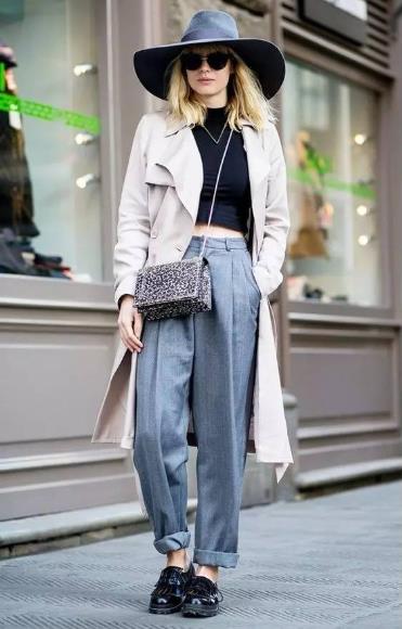 3、落地长裤 这是现在特别流行的一种裤子,它的版型是比较宽松的,很适合腿比较粗的人,而且有一些款式会有破洞的设计,风格上就很时尚,显瘦也比较好看。