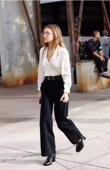 阔腿裤和运动鞋的搭配,让整体都是休闲运动的感觉。就算正式感比较强的黑白配衬衫+阔腿裤,脚下一双帆布鞋立马休闲了,有种随性慵懒的帅气感。