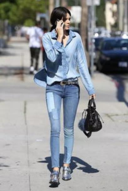 搭配6、超显帅气感的深色系牛仔衬衫,搭配黑色紧身裤和白色小皮鞋,真是大方又迷人,手里拿着的外套天气有点冷的时候可以披在身上。