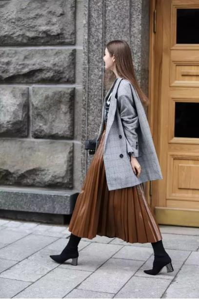 搭配西服更加利落干练。如果想更正式OL一些,就内搭衬衣,搭配细跟剪头皮鞋。百褶裙的材质可选择比较有质感的。如果想轻松随意些,就选择休闲款西服,内搭吊带、T恤等。裙子选择轻薄飘逸材质的。