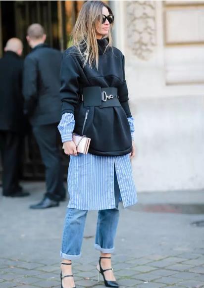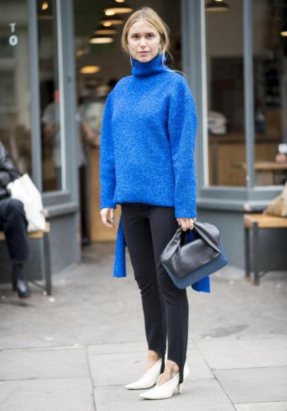 搭配六:蓝色上衣+黑色裤子 蓝色是比较深的蓝色,很多小仙女会很困惑,其实这种深蓝色比较适合搭配浅色的裤子,但是也不说不能搭配黑色的裤子。黑色的裤子一直以来都是既百搭又显瘦的,受到很多小仙女的喜爱,那么深蓝色的上衣搭配黑色裤子,如果只是单纯的这样就会显的比较沉闷,但是在配饰上的单品我们就可以搭配白色的包包或是鞋子来提亮整体的造型,让它整体看起来没有那么的沉闷。