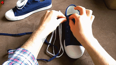 4、将另一边的白色鞋带也用同样的方式穿过蓝色鞋带,要跟步骤3的鞋带上下交织的方向分开哦!