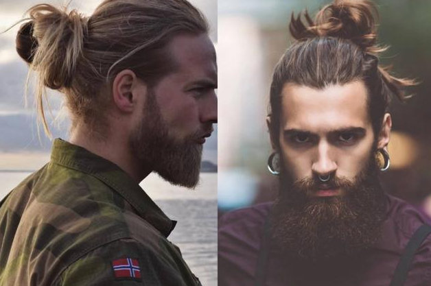 露额设计使得这款丸子头倍显清爽,络腮胡子彰显出浓郁的男人味,丸子头搭配眼镜很有文青的感觉。