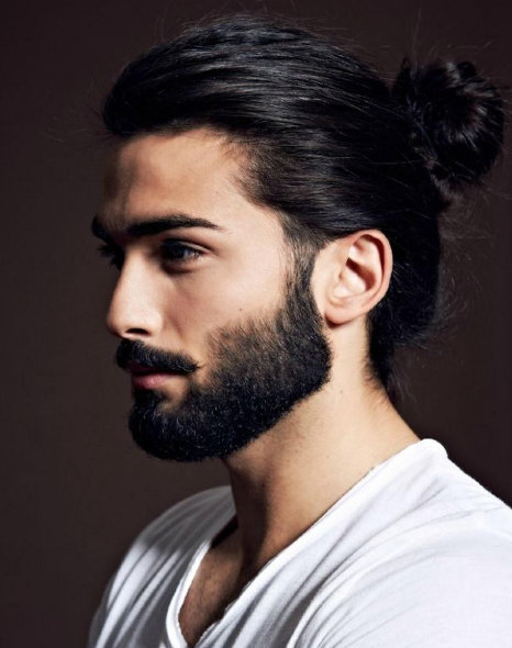 短发打理得非常细碎,带有自然的卷翘,半扎丸子头使得留着络腮胡子的男人年轻了不少。