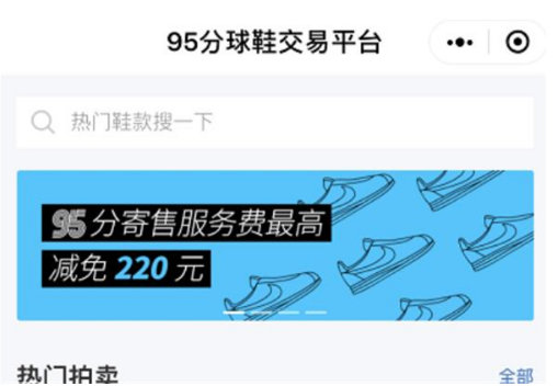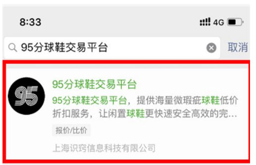 大家只要打开微信点击发现,然后在搜索栏里面输入“95分”下面出现的第一个就是的,点击一下,点击第一个就是识货95分球鞋交易平台,大家注意看logo哈,点击第一个就直接进入到了95分球鞋交易平台了。