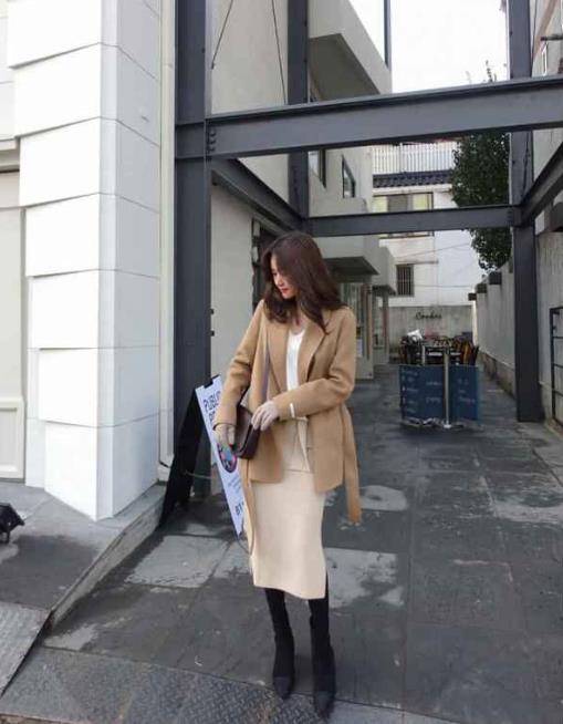【搭配Look3】 推荐搭配:毛衣+百褶裙 茧型版型的杏色毛呢大衣,中长款,任何身高都可以驾驭,款式是很简约大气的款,加厚面料,御寒保暖,最简单的内搭就是内搭毛衣+半身裙,当然,若觉得这样穿很冷,可以选择各种裤装即可。