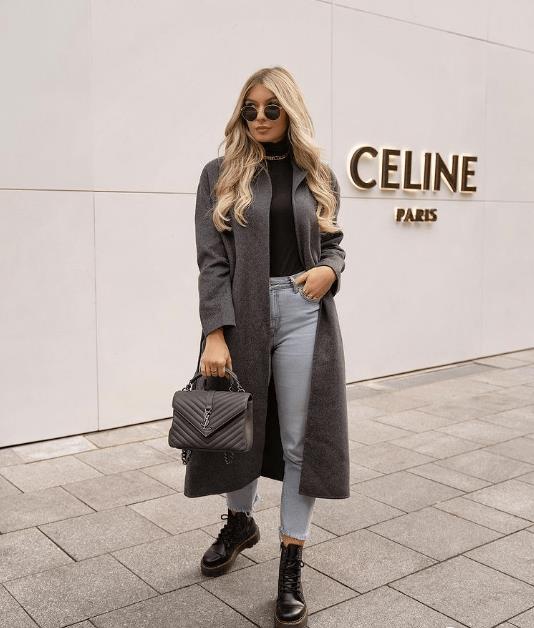4、马丁靴搭配呢子大衣、穿着铅笔裤搭配马丁靴,气质女生非你莫属。