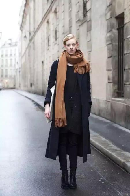 黑色是一种很高级很经典的颜色,这个色调内敛又深沉,并且也可以很复古很高贵哦。黑色大衣搭配纯黑色的围巾也特别合适,看起来有着满满的低调时尚感。并且,黑色的围巾还能起到衬托肤色的作用,肤色白皙的朋友最合适啦!