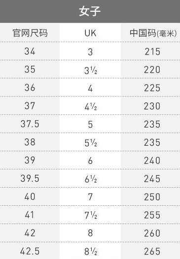 2.Adidas阿迪达斯女鞋中码标准采用毫米数,即测量脚长的长度。如:215mm的脚长,对应的英码是3、官方网尺码是34。