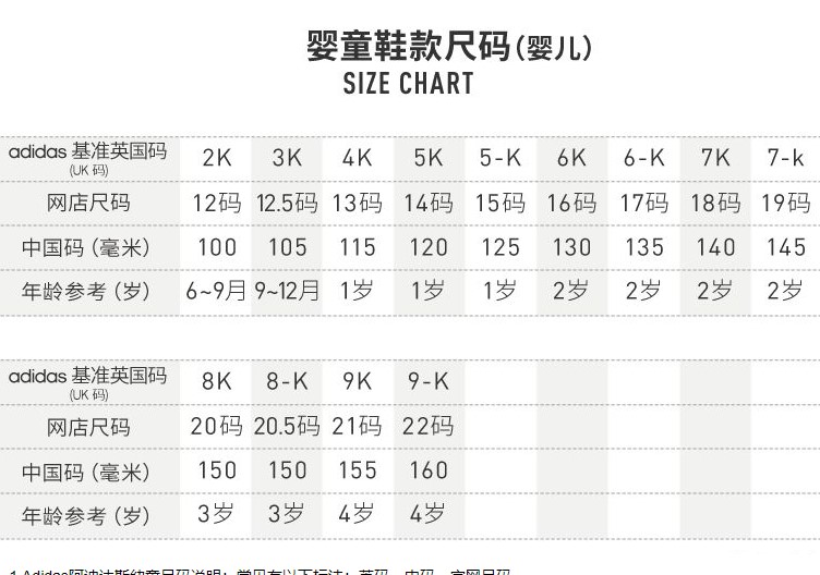 1.Adidas阿迪达斯幼童尺码说明:常见有以下标法:英码、中码、官网尺码。