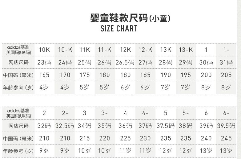 三、Adidas阿迪达斯童鞋尺码对照表: