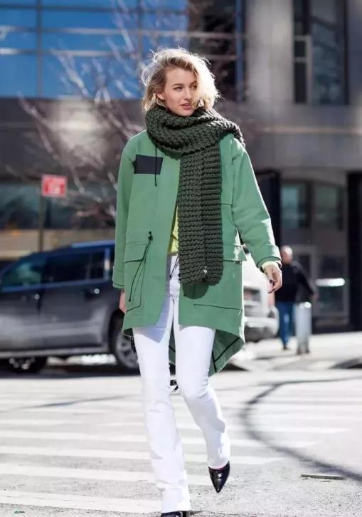 样式普通的围巾造型,在整体搭配效果上会给您耳目一新的感觉。这种围巾会使脖颈处稍显蓬松,所以在搭配大衣时,要将衣领立起,把围巾系在外面,这样看起来不会显得臃肿。
