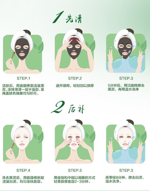 2. 后补:接着使用白泥,黑泥洗去后,在面部半湿状态下,用面膜调棒取适量白泥,均匀涂抹于面部;用食指和中指以划圈的方式轻柔按摩面部2-3分钟,按摩后,再使白泥在脸部停留8分钟左右,使肌肤充分吸收营养成分。最后用洁面棉擦去白泥,再以温水洗净。 另外使用时配以经络美容手法能促进产品中草药精华更好地吸收。