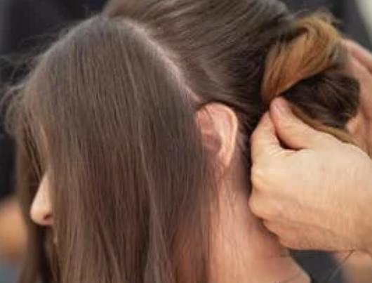 1、头发全部捋到后面,用左手握紧。指头伸进后脑勺靠下的头发中间,如图圆圈处。把右手的拇指和食指从步骤2的小洞处穿出。再抓住左手握住的整束的头发,穿过步骤2形成的小洞。再次重复步骤2-3的动作,也就是指头穿过后脑勺的头发(不是原来那一撮)后,让左手握住的整束的头发再次穿过小洞。