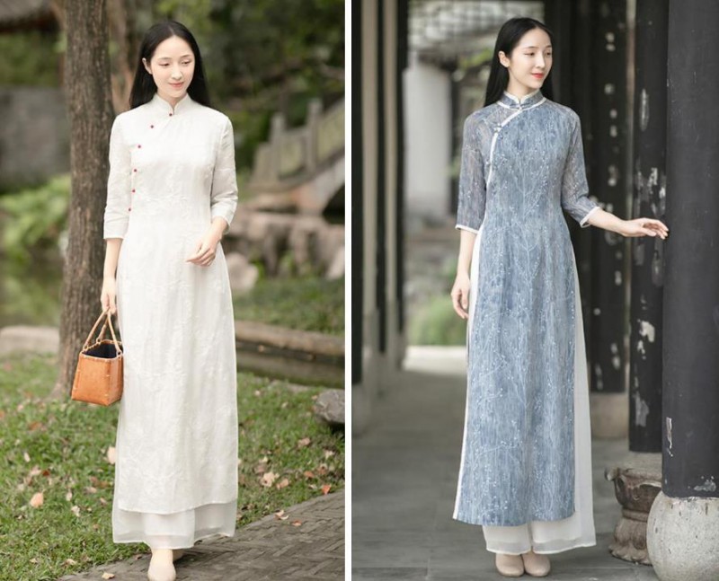 这款蓝色水墨风旗袍是非常典雅的,搭配一件白色绣花风衣,是一套非常具有中国风的搭配。
