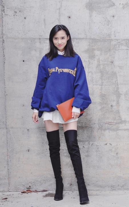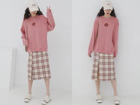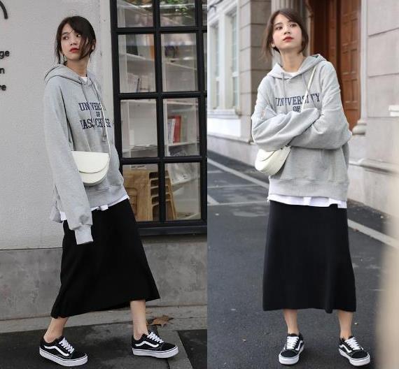 2. 圆领卫衣跟连衣裙搭配:这种穿搭其实跟吊带裙差不多。连衣裙跟卫衣穿搭,主要是露出了裙摆,在选择的时候,要把连衣裙当成下半身穿搭,这个时候只需要考虑裙摆是否跟卫衣搭配就好了。
