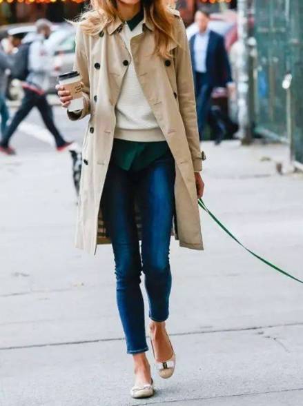 5、卡其色风衣+米色毛衫+深蓝色破洞牛仔裤+小白鞋:这套搭配是很韩系的风格,卡其色风衣内搭一件米色毛衫,下身搭配一条深蓝色破洞牛仔裤,再配上一双小白鞋,优雅又很有女神范儿。