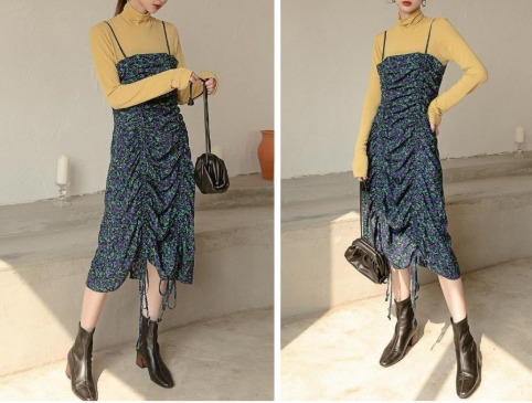 4. 吊带裙 这是一款吊带设计的印花连衣裙,看起来真的时髦到不行,穿上这款春季流行的裙子,绝对是全场最靓的girl,抽绳的设计,可以根据自己的喜好整理褶皱感与长度,令整个腰部更显纤细,单穿或者叠穿都很ok,绿色的底色搭配蓝色的小碎花,真的美到极致!
