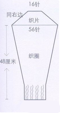 ④袖子:织圈。6号针起40针阿尔巴尼亚针,织7厘米高后织平针,在中间选2针作为加针点,在这2针左右各加1针,之后隔11行第]2行再加1次,织到48厘米长后,共加了8次,多加出16针,整个袖子最肥处为56针,之后在加针点的左右各平收4针,这样开始织“袖山”。