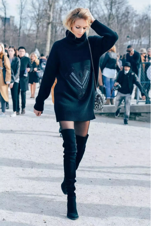 很适合懒人的冬季女士搭配,黑色及膝高筒靴搭配一件宽松中长款高领毛衣,背一个斜挎包,给人慵懒的感觉,又不失时尚感。