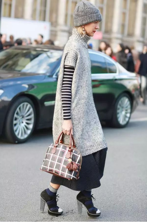 一般这种长款毛衣常规都是宽松版型,显瘦遮肉不挑人,几乎适合所有身材的妹子。这种毛衣日常搭配长筒靴或者长筒袜加单鞋,就非常街头慵懒自在。