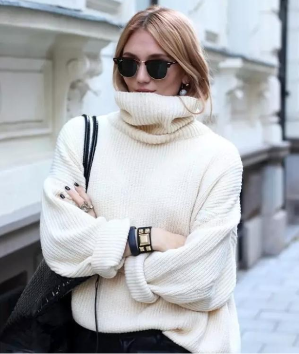 一件简洁大方的高领毛衣除了给你温暖,搭配一些浅色或青色或基础的黑色就能有点文艺的感觉。