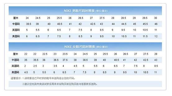 NIKE鞋子的尺码和很多国际运动平牌一样,有美码,欧码的区分,就是我们常常看到的US,EUR进口NIKE到大陆来都是由大陆的公司来标定尺码的,因为是国外生产,国外人脚比中国人脚偏大,所以标码比实际码会偏大一点点,但是国内生产并投放国内市场的的NIKE都是按照亚洲人脚形大小而制造的,是标准码,无差别,所以请看准你看中的鞋是哪里的货,再对应的看尺码就可以了。不过在大陆销售的基本都是标准码,因为大陆是世界上比最大的生产基地,别说在中国了,就算在美国,日本,东南亚买的很多很多都是中国制造,不用担心。