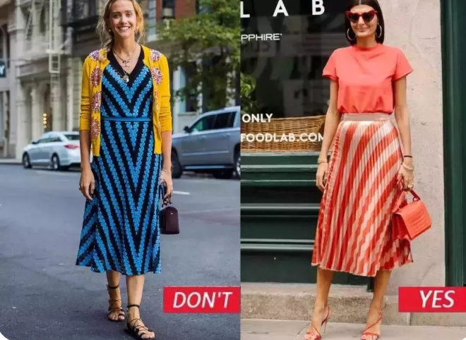 如上图,右边的搭配做到整体色彩的呼应,就比左图中更好。为什么呢?其实两件裙装,大家可以看到,都是差不太多的,是很夺人眼球的类型,那么重点来了:当已经有一件亮眼的单品,其他搭配都要来衬托它,而不是来和它争奇斗艳的。所以,在搭配上要选择款式尽量简单的。