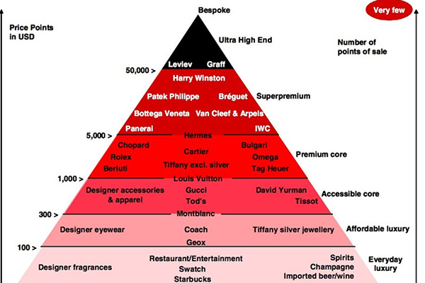 综上所述,奢侈品等级有着顶级高端、超高端、中端、平民化这样的品牌等级区分。为了展示全球主要品牌等级,Rambourg建立了一个品牌金字塔,囊括了诸如星巴克这类更加平民化的品牌到类似Graff钻石这样的超高端奢侈品牌,应有尽有!