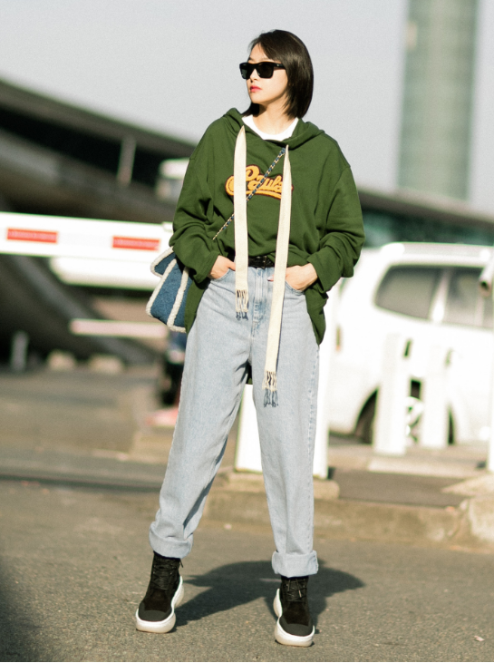 NO.4宽松的版型,上身最藏肉显瘦,连帽设计,不仅休闲还减龄,很多女孩都喜欢,简单搭配这么一条牛仔裤,青春减龄,还休闲!