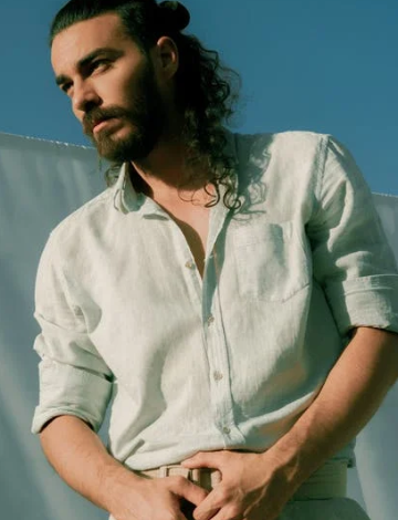 2.衬衫最下端系扣子,衬衫上部扣子解开,呈现天然大露锁骨的效果。