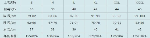 服装号型标志:号型的表示方法为号与型之间用斜线分开,后接体型分类代号。例如:上装160/84A,其中160为身高,代表号,84为胸围,代表型,A代表体型代号;下装160/68A,其中160为身高,代表号,68为腰围,代表型,A代表体型代号。本尺码对照表仅作参考之用。请您在试穿之后量身选择适合自己的尺寸。