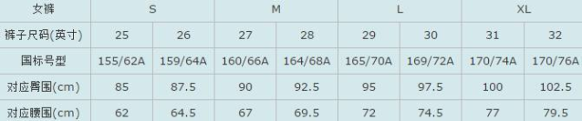 女裤尺码对照表