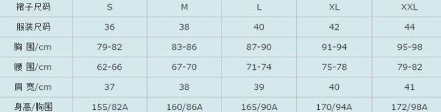 女装标准尺码对照表