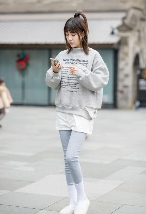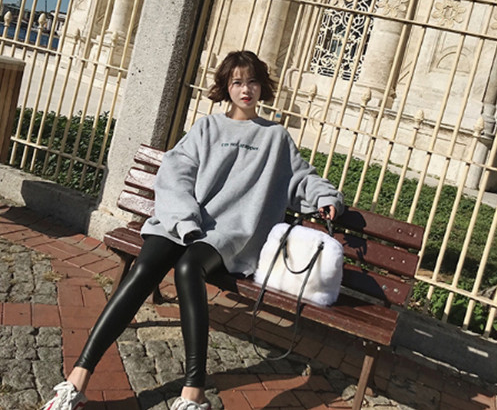 一件简洁的英文的灰色oversize卫衣给人一种偷穿男朋友卫衣的感觉,会显得人非常的娇小,搭配一件黑色皮裤会显得更加有的摩登时尚感。