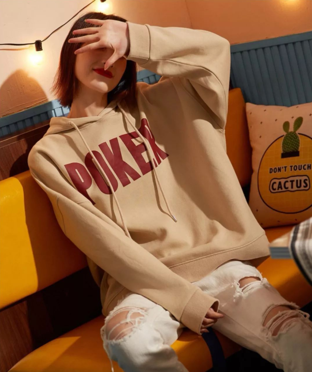 穿上宽松的卫衣后,人的身形会自然变得更加较小,也更加的显瘦弱,给人一种保护欲爆棚的感觉,今年很流行宽松直筒无螺纹收口的卫衣,像上面这款蓝色连帽的宽松卫衣,下面搭配一件齐臀的包裙或是A字裙,显得非常的可爱而且减龄,像只可爱的小猫。