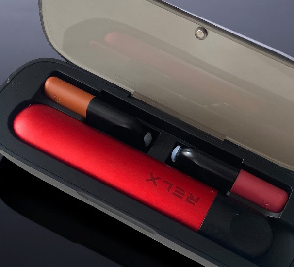 RELX悦刻电子烟在外观造型设计上很有档次感,小巧的电子烟身材仅有4枚1元硬币大小。整体的电子烟杆采用磨砂材质,增添了高档感,中间有一个白色的灯,用来显示各种状态信息,具体为:当正常吸烟的时候,灯光长亮,然后缓慢熄灭;电量不足的时候,吸烟过程中灯光会不停地闪烁;充电时候,白灯亮,充电完成,灯灭。下方为RELX的标识。底部是通用USB插口,简单直接内置350mAh电池,去支持6W的恒定功率输出。RELX悦刻电子烟的配色也还有很多选择:经典黑、深海蓝、星空灰、玫瑰金、实力红、炫紫星海、金粉暮光、流金夜影8种。