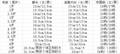 1-10岁的儿童鞋码,男女童鞋码会有差异,因为同等岁数中男童的脚长会比女童的脚长长出一点,所以挑选在鞋码上也会不同。女童1-10岁的鞋码一般是16-34码,男童1-10岁的鞋码一般是17-36码,每相差一个码数,鞋子的内长就相差0.5cm左右。