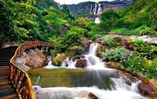 白水寨山山峦层叠,花草葱茏,空气清新,让人心旷神怡。由于海拔较高,这里气候凉爽,山中温度比城市足足低5℃。正值夏季,落差达428.5米的白水仙瀑踏入丰水期,水量大增,景观壮美。沿古朴厚实的海船木栈道上山,观瀑平台巨幅瀑布倾泻而下,清凉水花扑面而来,负离子含量百倍于城市的清新空气包围身心,青山绿水的自然景观让人非常放松。