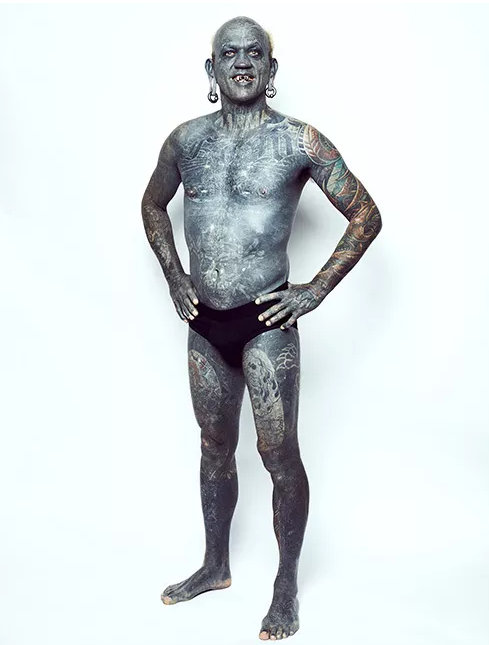现在,他的纹身拥有超过200%的皮肤覆盖率,包括眼睑、脚趾间细腻的皮肤、耳道上部甚至牙龈。