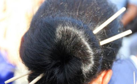 筷子发挥作用的时间到了。从发髻上面挑起一小股把筷子插进去,筷子顺头皮插进去,从发髻下端出来,再拉一小股压到筷子下面。