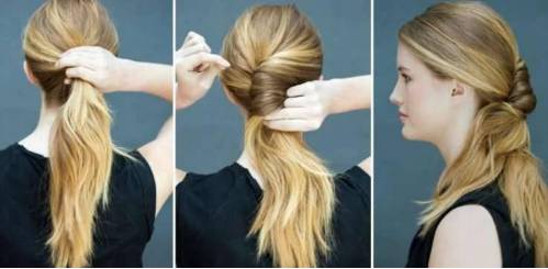 7. 绑一个高马尾,将发尾从中间穿过来,固定成丸子头。