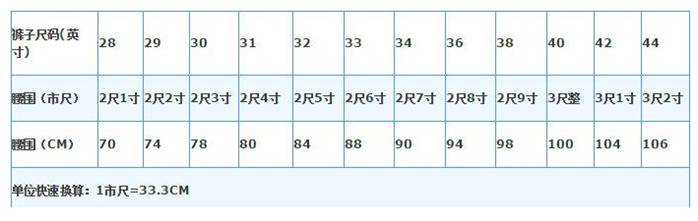 衣服标牌上标注的尺码,比如160/68A,前面160指的是身高,68指的是腰围。那么腰围的数字大概指的是多少呢。比如常见的31码指的就是二尺四的腰围也就是80厘米。32也就代表的二尺五的腰,也就是八十三点五厘米。以此类推。