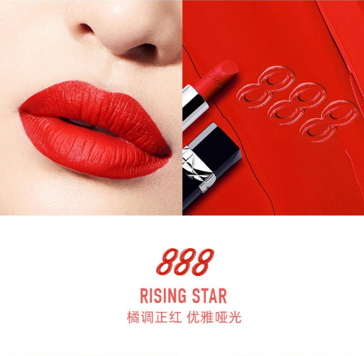 888是被推荐在春节的发财色,过年好兆头,色号888,颜色也要更明亮。像是被稀释了的999,少了一些气质但更多的是活泼热闹的意味。薄涂略微偏橘,黄皮肤比较迪奥999之后会发现888要更减龄一点。999太暗,如果不化妆会显老气。
